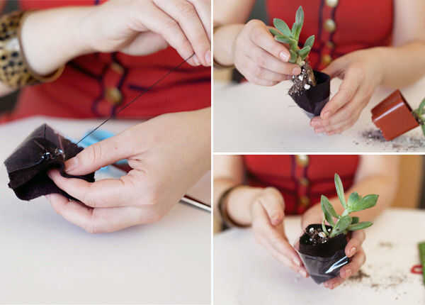 Asegurar el plástico y fieltro bolsillo con varias puntadas. Luego llenar el bolsillo con suelo y añadir la pequeña planta, empujándolo firmemente en su lugar dentro del bolsillo. Paquete en suelo adicional si es necesario, pero trate de no alcanzar el borde superior del bolsillo.