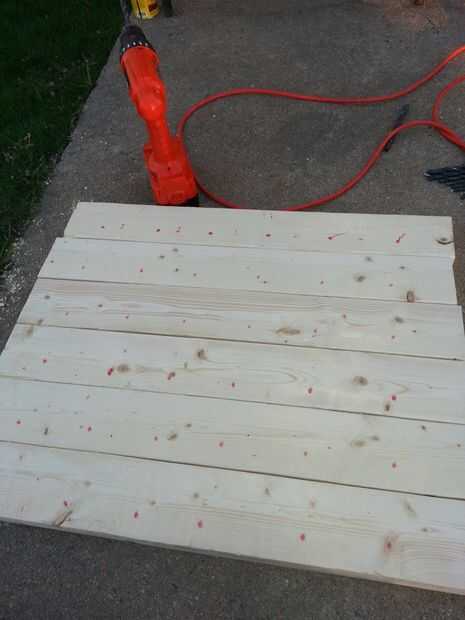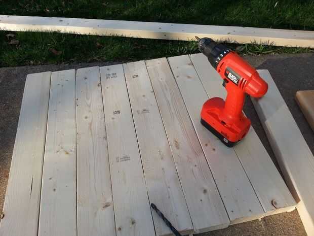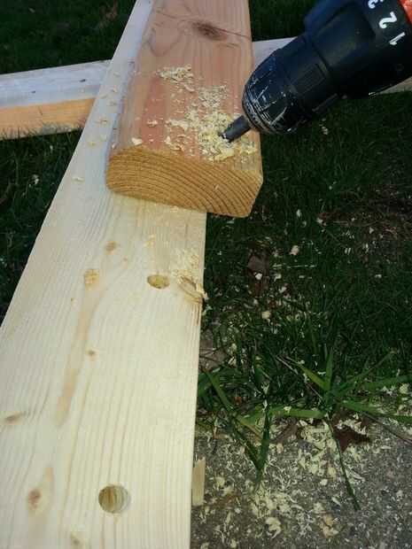 Hubo 25 pulgadas entre cada junta vertical marco así que corte el 2X4s (cuatro) en tres secciones. Esto me dio 12 tableros horizontales. Luego medidos y marcados los agujeros cerca de 4 pulgadas aparte tuve 6 ranuras para los paros. Perforé las ranuras angulares para las clavijas usando un 3/8 de pulgada broca y una plantilla que había creado de un pedazo de madera.