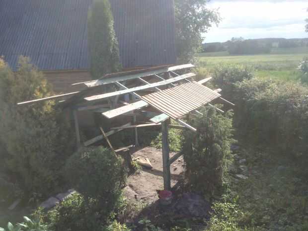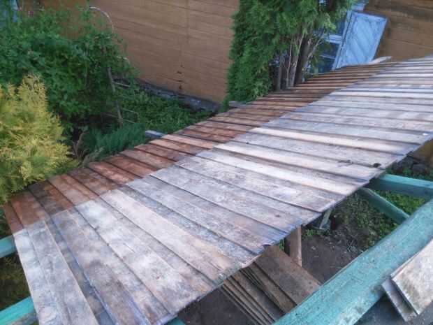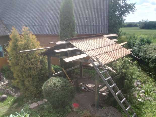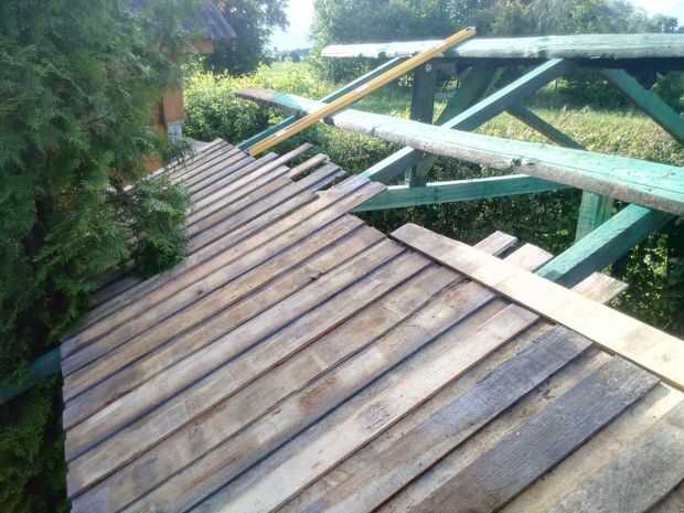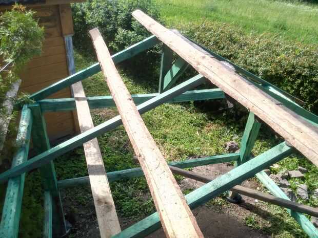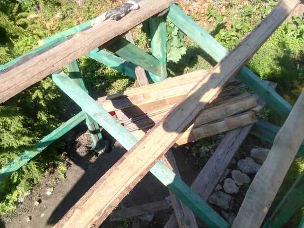 • Después de puse 4 tablones largos horizontalmente sobre los soportes diagonales y comenzó a colocar el techo sobre.