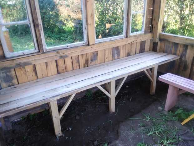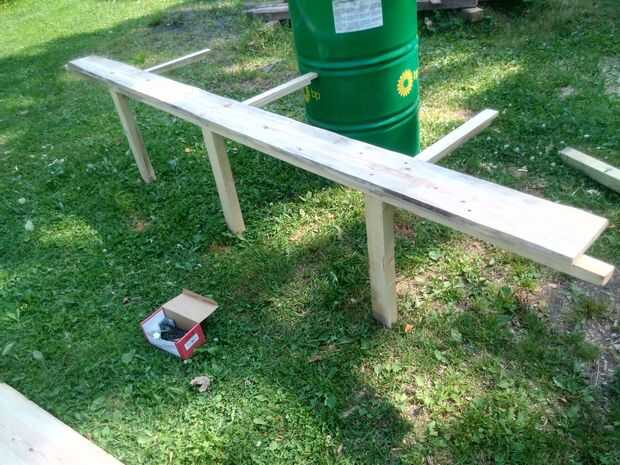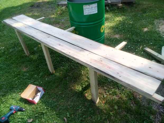 • Después poner unos tablones en la parte superior y había añadido unas piernas y apoya a la banca.