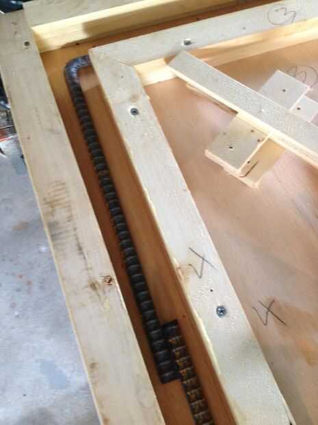, Con algunos edificios de hormigón viejo, me sentía un poco toque de barras en el producto final podría mejorar su carácter, así doblado y cayó cuatro pedazos de varilla en el formulario antes de verter.  Ver ilustración (5).  Yo también revestido la forma de la madera con cera para que el marco salen de la forma más adelante.  Probablemente hubiera sido una buena idea para construir totalmente con tornillos en lugar de clavos como lo hice.