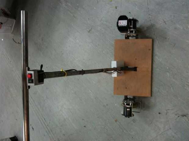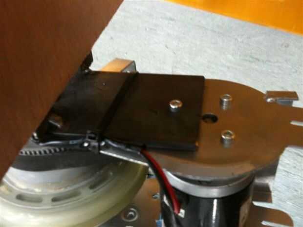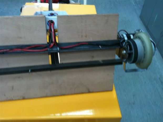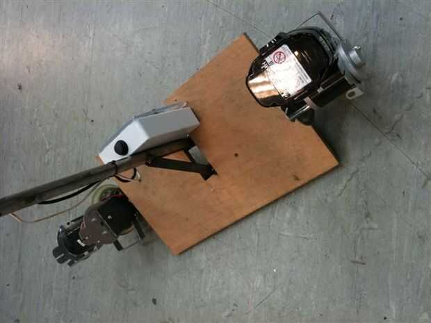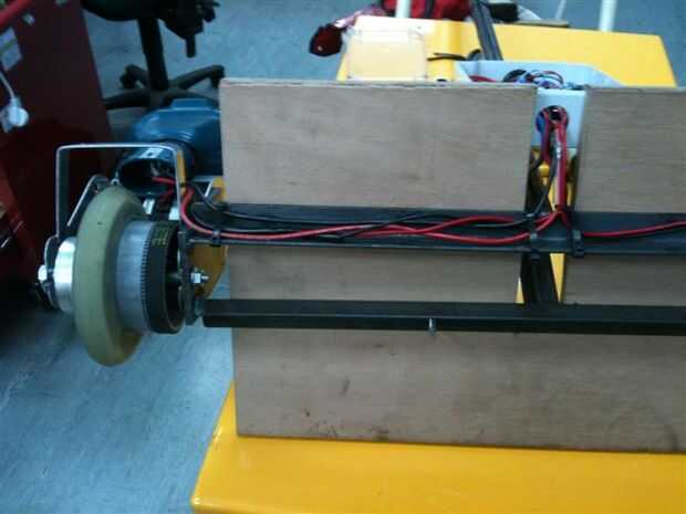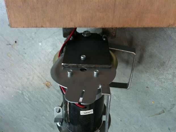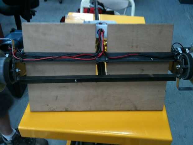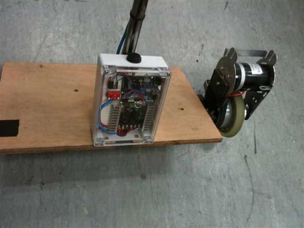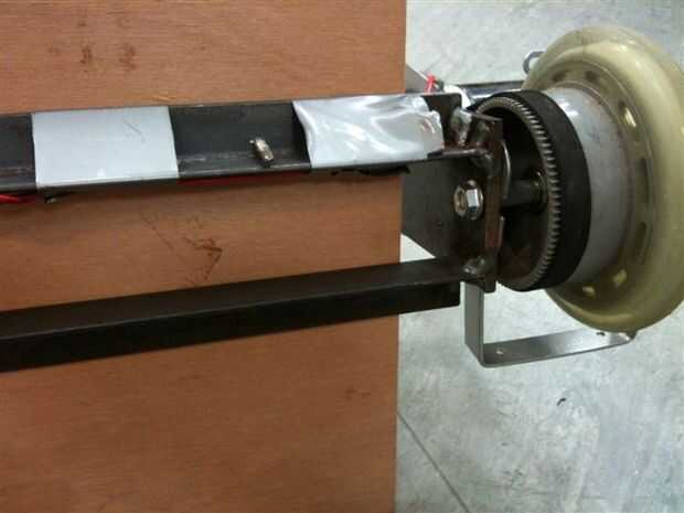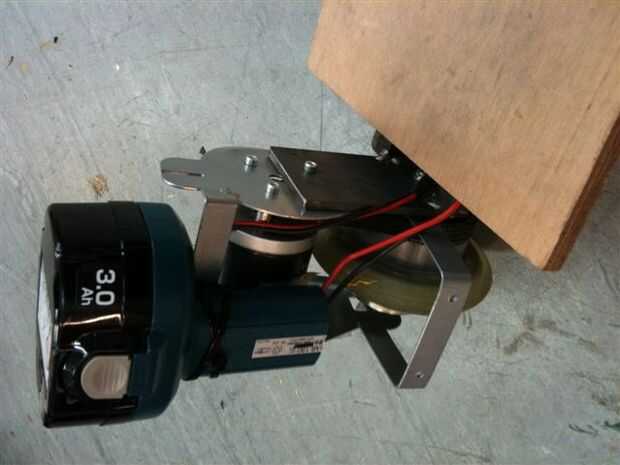 Cortar las 2 piezas de ángulo de acero al ancho necesario para los pies. Los agujeros fueron perforados en las placas para que coincida con los orificios para los tornillos en la parte trasera ruedas de scooter. Estas placas fueron soldadas a las placas de ángulo de acero.