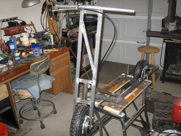 El manillar se hace de una pieza de conducto eléctrico y doblado a la forma. Os los adjunto a la parte superior de las horquillas con dos abrazaderas en forma de u.