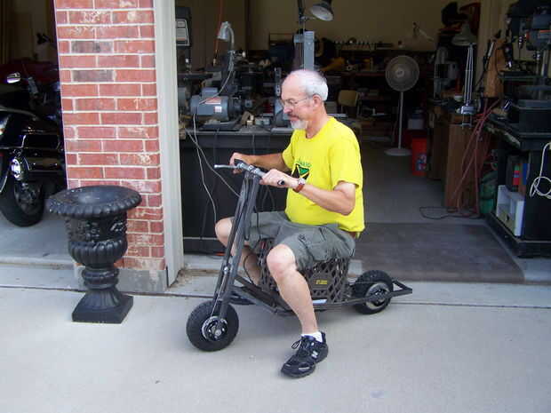 En esta foto he temporalmente montado en el regulador y las baterías y he instalado el acelerador para mi prueba inicial de funcionamiento. Es mí sentado en un cajón de leche. No demasiado cómoda en este punto, pero yo estaba feliz con su prueba inicial!