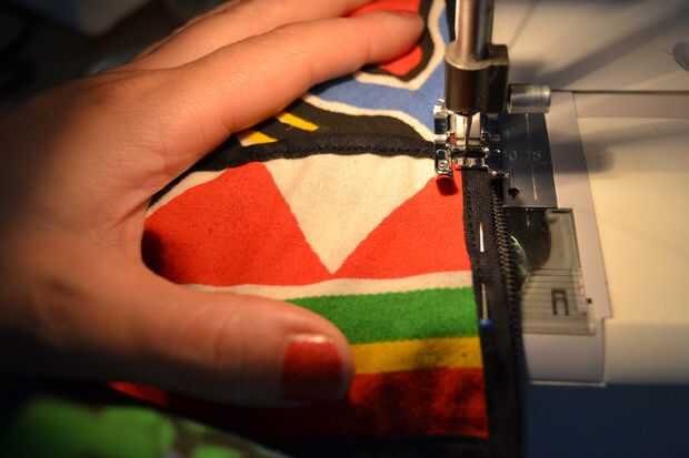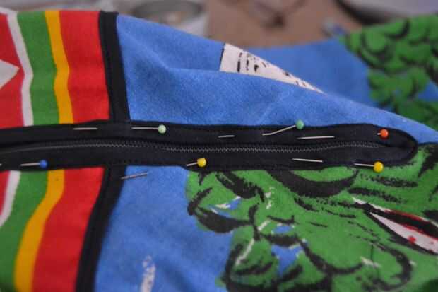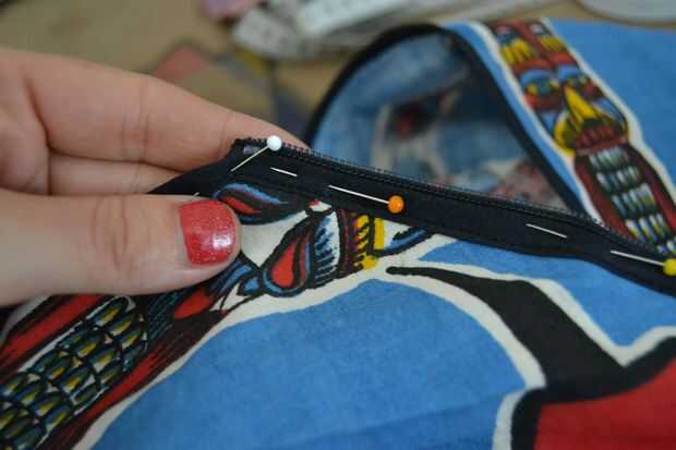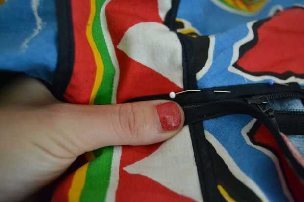 medir la ranura en la parte posterior donde la cremallera a ir (del centro superior de la espalda hasta el final de la ranura en la parte superior de la pieza de la falda) a ver cuánto una cremallera que se necesita, en mi caso 40 cm. compre uno en un color que empareja la cinta bies o uno que se adapte a los colores de la tienda. Prender la cremallera a la abertura y coser en, tratar de coser por la costura ya existente en el sesgo de la cinta (ver fotos).