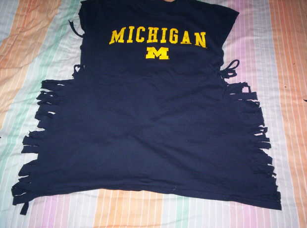 Corte los lados, para que la parte delantera y trasera son independientes. Doble nudo cada franja. Atar firmemente para que se situe en los agujeros son pequeños.