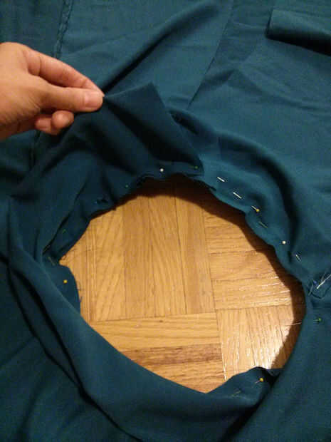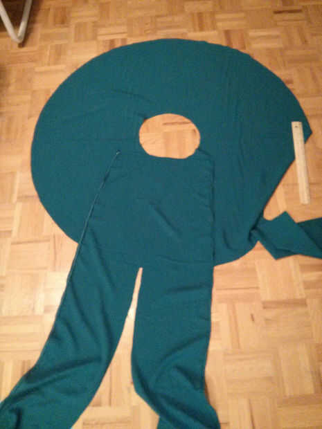 1) usted desea colocar su material por la primera imagen que se muestra, donde primero pone abajo de la falda de círculo, y luego las dos correas. Si se puede ver en la imagen, las dos correas superponen unas 3 pulgadas - cuanto más usted se superponen, el más conservador el vestido y menos se traslapan, más grande será su sección escote expuesto así mantener esa en mente en cuanto a cómo desea el vestido a salir.