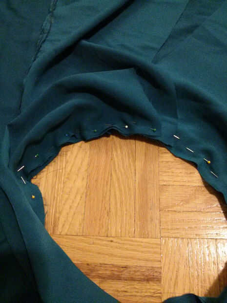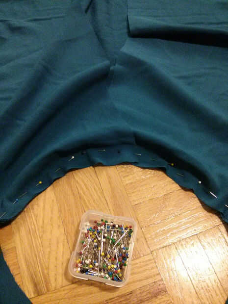 2) ahora, agarra tus pins y comenzar fijando las tiras a tu falda de círculo.