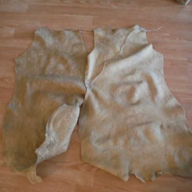 Los lados de este vestido son los cordones. Se hace el encaje pero cortando un pedazo delgado de un borde de un hide. En términos simples, el cordón es cadena de cuero. Sostenido de uso un punzón, o cualquier cosa, para perforar agujeros a lo largo del vestido y el hilo el cordón a través de. Es como coser la tela, pero en una escala mucho mayor.