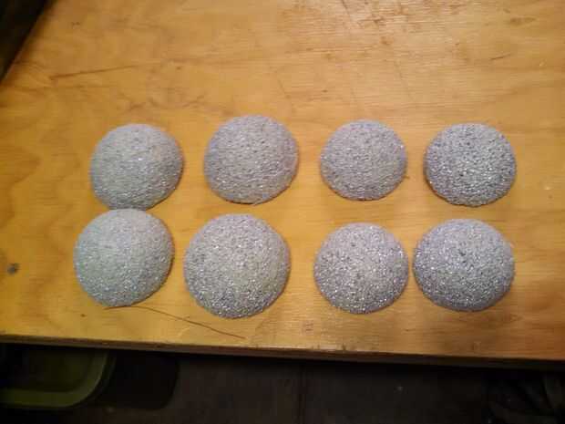 Entre capas en el vestido, empezar a trabajar en los "huevos". Cortar tus bolas de espuma de poliestireno por la mitad con un cuchillo de sierra, luego extienda sobre la superficie de trabajo. Utilizado la misma pintura plata en estos, luego terminar con una capa de brilla en la oscuridad. Realmente no brilla mucho, pero varias capas probablemente ayudaría si realmente quieres que brillan. Tenga en cuenta que toma la espuma de poliestireno mucho tiempo de secar, así que trata de múltiples capas muy delgadas.
