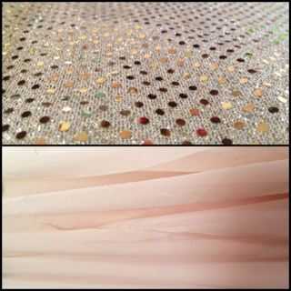 * Elegir una tela de lentejuelas de oro de la parte superior y una tela de Gasa champagne para la falda. Para un tamaño pequeño, de 2 de las mujeres, necesita aproximadamente de 2 yardas para el cuerpo y 3 yardas para la falda. Agregar o quitar tela por consiguiente el tamaño de su vestido deseado.