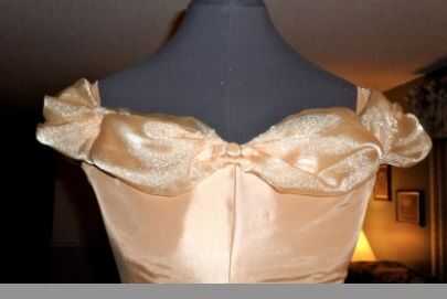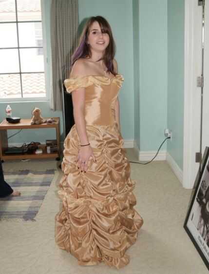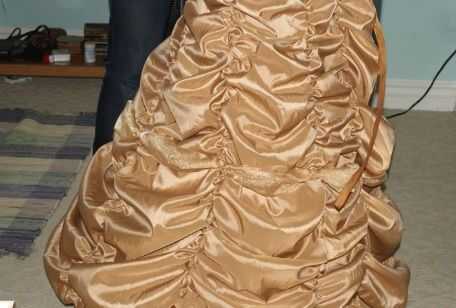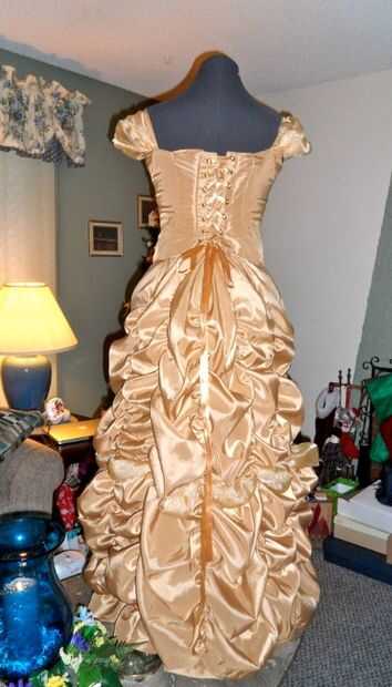Hice un conjunto de estancias strapless medio deshuesado y había intercalada con ellos entre las capas internas y externas de la blusa y suturan las capas. Me rouched el balón vestido de falda y unido a la blusa. Dio la blusa mangas de organza capsulado como Belle tiene en la película y juego de botones de tela de oro para el centro del escote. Ató el vestido por la parte de atrás y dio el vestido a juego con volantes de la falda.