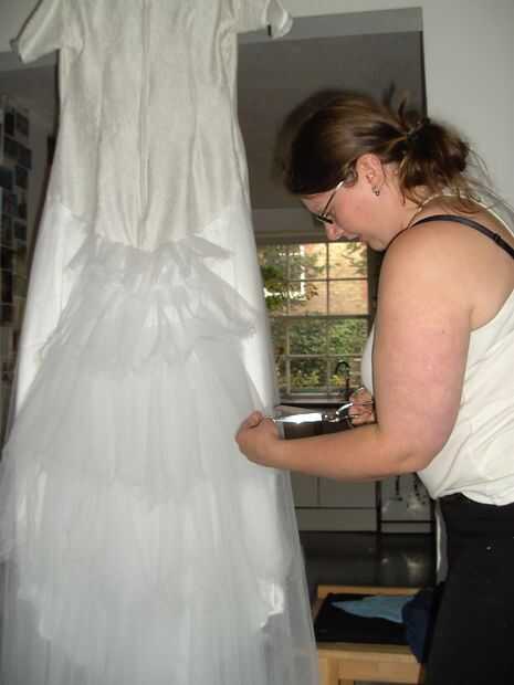Mi hija quería netos volantes en la parte posterior del vestido así tomé longitudes de red y cortarlas a la medida, cubrió en su lugar y había cosido en. Ella quería que buscar ondulado e insolente en lugar de recta por lo que hemos picado en cada colmena.