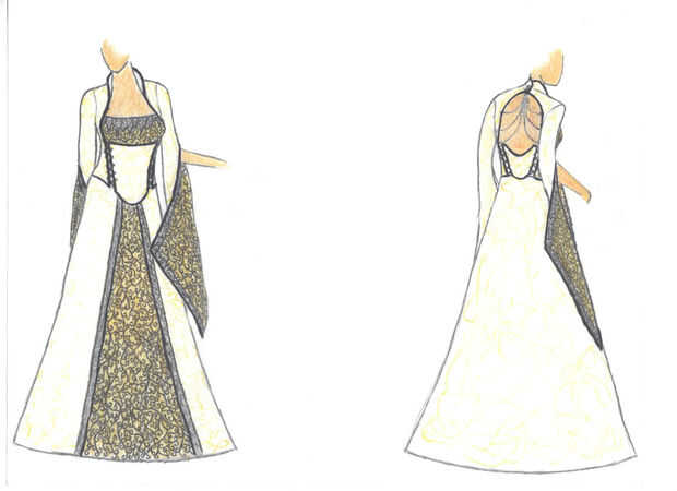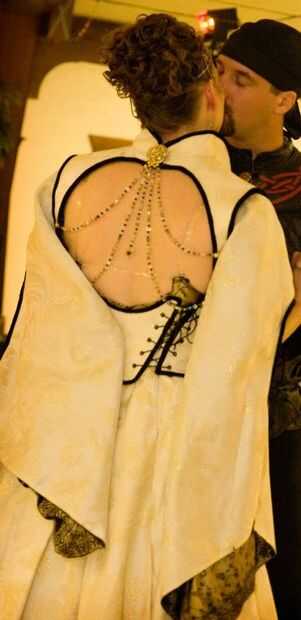 El vestido está hecho de 3 manteles de Martha Stewart (el blanco con fibras de oro tejido a través de), material de sari oro y negro, de terciopelo negro para atar los bordes. El ajuste hacia abajo de la parte delantera fue una cinta de terciopelo de 2" cortar en la forma, hay cerca de 200 cristales de swarovski, drapeados en la espalda, así como con muchos en el encaje del escote.