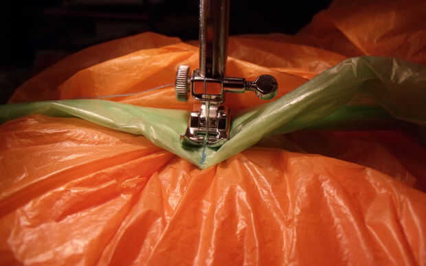 hecha de tiras de bolsa de plástico tiradoPaso 1: Se necesita... 1 par de tijeras3 bolsas de plástico negro (bolsas de la tienda de licor)1 superficie capaz de perno grande (yo usé una forma de vestido)1 caja de alfileresPaso 2: Cortar la bolsa 1. co