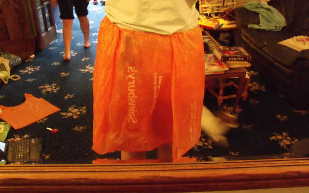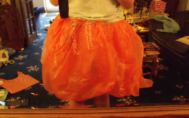 Un Consejo a ver si tienes suficientes bolsas para la falda - tomar un cinturón o longitud de hilo y tela maletas 'superior y colas' sobre ella. Lazo alrededor de su cintura y distribuye uniformemente las bolsas. Agregar más o quitar algunos hasta que estés feliz. Depende de usted en cuanto a cuántas bolsas es suficiente, ¿quieres una falda ajustada? ¿O un floaty grande? (va a ser muy flotante después de todo, está hecha de plástico!)