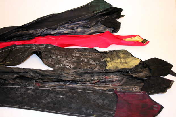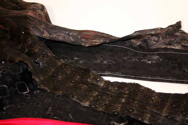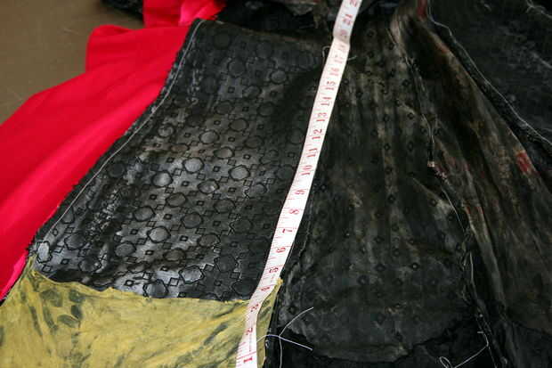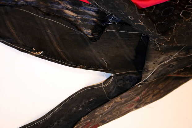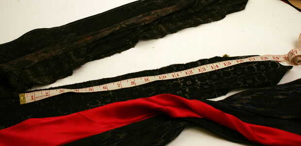 - Un lazo en el lado del frente de centro, deje 18" abiertos de las esquinas superiores de la corbata. (En el caso de mi traje, la corbata rosa se cose en ambos lados.)