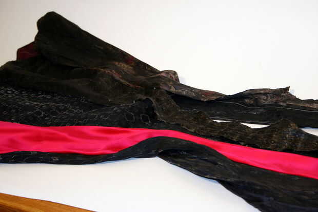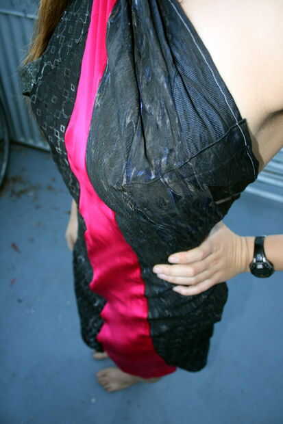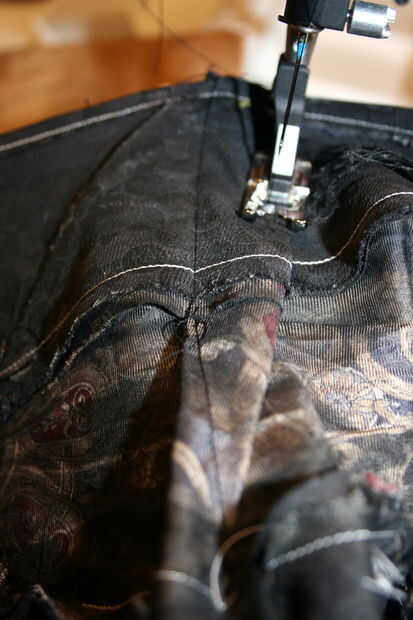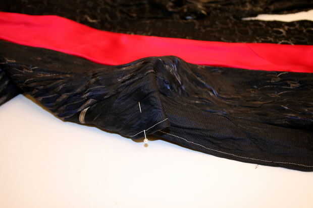 PIN un dardo para cada mama - acortar el borde hasta que se ajusta, luego formar un triángulo hacia adentro de los lazos del borde aproximadamente 2 hacia adentro desde el borde.