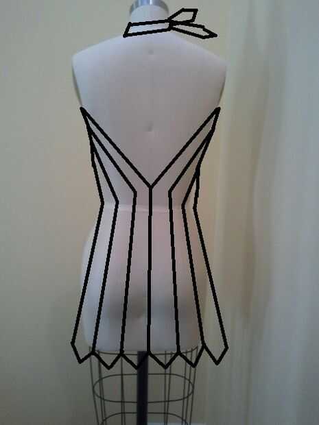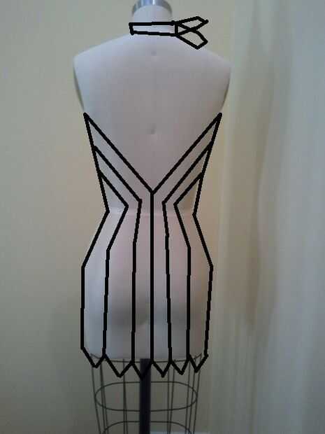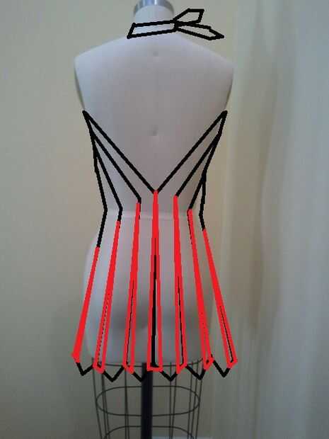Contraer la forma de la falda alrededor de la culata como (aproximadamente) se muestra en los diagramas. En el dobladillo, cada uno de los amarres debe ser reducido a una cantidad incluso.