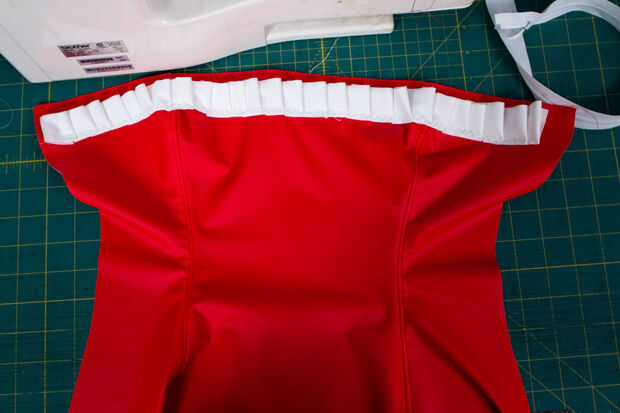 • Aproximadamente 1/3 de pulgada de la parte superior, coser el volante mini a las secciones frontales y laterales, utilizando un ajuste de la puntada en su máquina de coser.