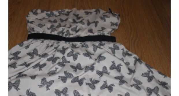 1. he ya corté la parte superior del vestido de mi como se puede ver. Girar su vestido de adentro hacia fuera y tomar su medida de cintura, mina es 31". Usando esta medida vas a cortar el elástico a la misma longitud y coser ambos extremos del elástico junto. Mi vestido ya tenía un poco de elástico en él pero era demasiado flojo para usar alrededor de mi cintura, así que tuve que usar elásticos nuevos. Luego coloque el elástico alrededor del vestido donde desea tenerlo.