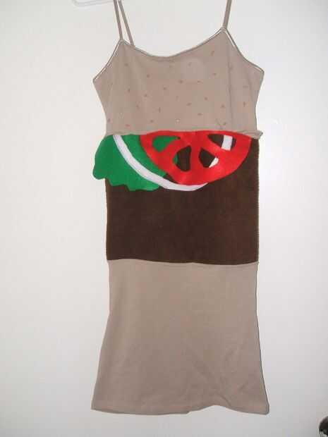 pensé que coser la parte inferior del vestido sería la parte más difícil, pero en realidad no estuvo tan mal. Sólo asegúrese de pin en la parte delantera, parte posterior, lados y luego poner un perno más entre cada uno de los pines. La tela no manojo me en todo cuando se cose, a pesar de la disparidad de tamaños de la parte inferior de la empanada y la parte superior del moño abajo. Una vez que termines con esto, tienes un vestido de hamburguesa completa! Sin embargo, por 30 centavos adicionales de fieltro, puedes actualizar a una hamburguesa con queso. Mano coser los triángulos de queso de la misma manera como se cosen los tomates.