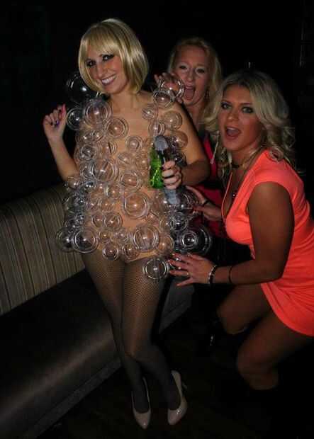 Sacar la aguja e Hilo desnudo y empezar a coser sus burbujas a su leotard. Esto toma mucho tiempo y paciencia! Puse una almohada en el leotard para ayudar. A menudo tenía que poner que me ayude a decidir donde quería poner las burbujas. Usando las burbujas más pequeñas en las grandes ayuda a impedir que cuelgan hacia abajo.