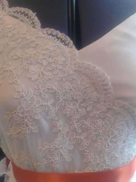 Decidimos que queríamos Fije la parte superior de encaje a la underdress, repito, con hilo claro, tuve mi amigo pisar en el vestido con la parte superior de encaje y viro esencialmente. No pude poner exactamente el top de encaje vestido sin su pie en él. Ella era un campeón para defender al menos una hora mientras yo estaba haciendo todo esto!