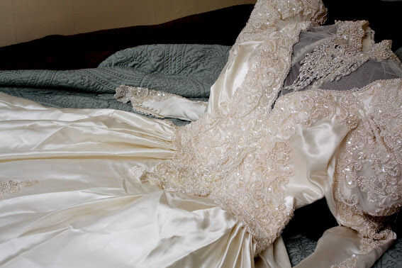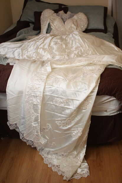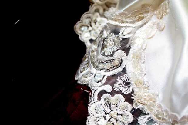 2) el largo tren necesitan ser cuidadosamente cortado y el encaje adicional cosido en la parte trasera del vestido.