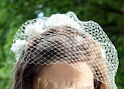 Corte una pieza cuadrada de la herramienta (el material de malla debajo de la seda) y añadir algunas flores (mina eran del original velo enorme) y el pin en tu cabello.