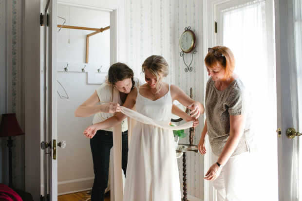 Mi consejo final y parte de esta historia debe terminar bien. Puede ser tentador para engañar un poco cuando usted ha estado trabajando en un proyecto tan largo y cuando el plazo está a punto, pero perseverar! Hice la hoja y arco en el último día antes de la boda y estando tan tentado terminar el arco termina por máquina, parecía mucho mejor terminar con la mano, pero haciendo esencialmente 8 yardas de un dobladillo enrollado via Sobrecosa lleva un tiempo. La final de la prensa y este vestido estaba listo para ir... hasta la mañana de la boda. Bueno me lleno un kit de cosas para llevar 'por las dudas,' como los sujetadores originales poner en la proa y marco (ganchos y los ojos) no guardó todo en su lugar lo que quería. Una carrera a la tienda más adelante, broches y pasadores de seguridad salvó el día!