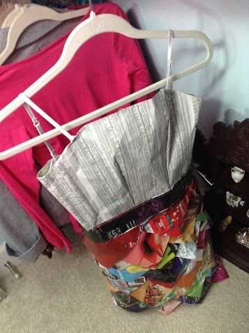 este fue el vestido de papel elegante mi estudiante de quinto grado llevaba para Halloween este año.Estaba hecha de papel de revistas pegadas sobre bolsas de plástico (bolsa plástica de supermercado para la bolsa de basura negra y top para la falda).