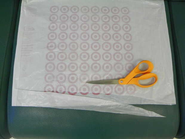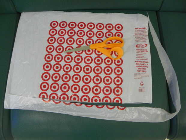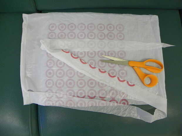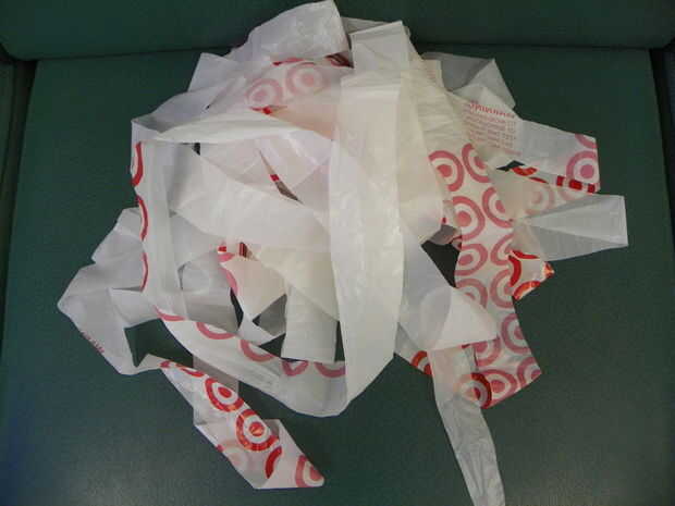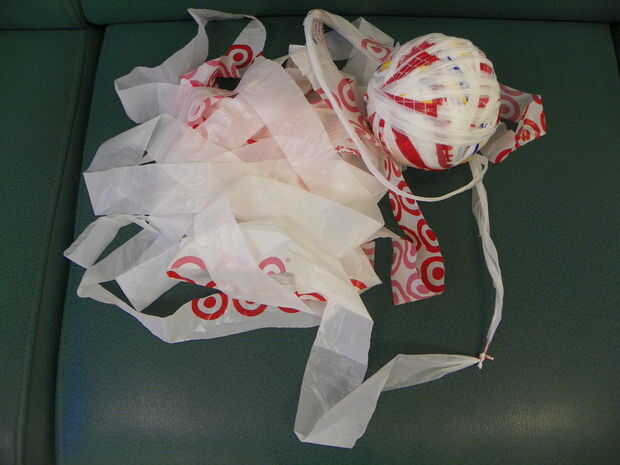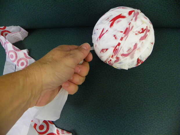 Flatten out the bag. Corte la parte inferior y las asas. Abrir la bolsa y empezar a cortar una tira de espiral de 1-1/2" de ancho, da vuelta la bolsa como vas. Seguir cortando hasta que quede una tira larga. Unir los extremos de las tiras, cortar la parte sobrante. Comenzar a rodar las tiras en forma de bola. Siguen atando las tiras juntos hasta que tenga 20 o 30 bolsas de corte. Esto puede llevar mucho tiempo pero me gusta cortar las bolsas mientras estoy viendo TV y, antes de que lo sé, tengo un par docena bolsas corte y enrollado en una bola.