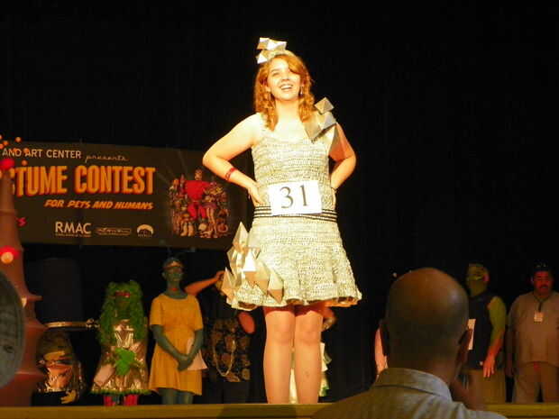 Nos hace varios "Cristales" de cartón de cajas de cereales, atado sobre el vestido y el aerosol pintado todo plata para un concurso de disfraces de UFO Alien en (¿dónde más?) Roswell. MMM El premio fue para una señora comiendo grillos vivos. Buenos tiempos... El vestido tenía el aspecto de cadena de maille. Si piensa en aerosol, pintura de la ropa, no hay para asegurarse de que todas las bolsas son de la misma tienda.