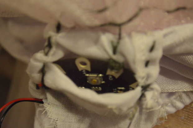 Convenientemente, este vestido tiene un bolsillo cosido en él. Coloqué el nenúfar en él y cosido alrededor de él.