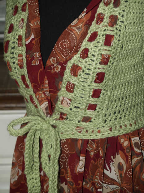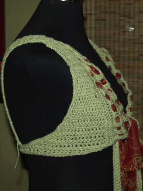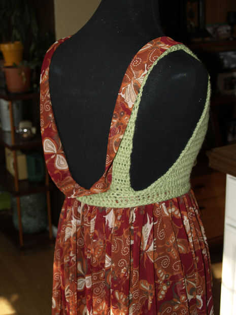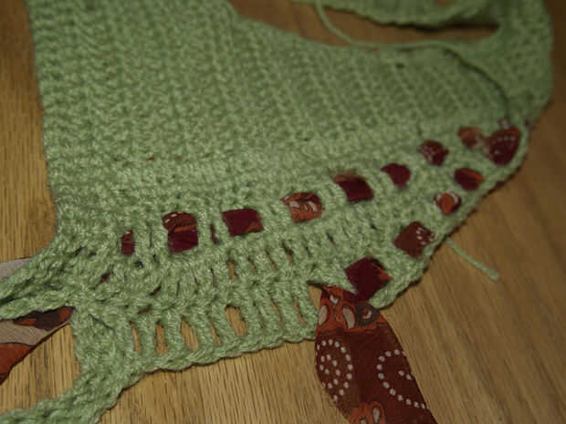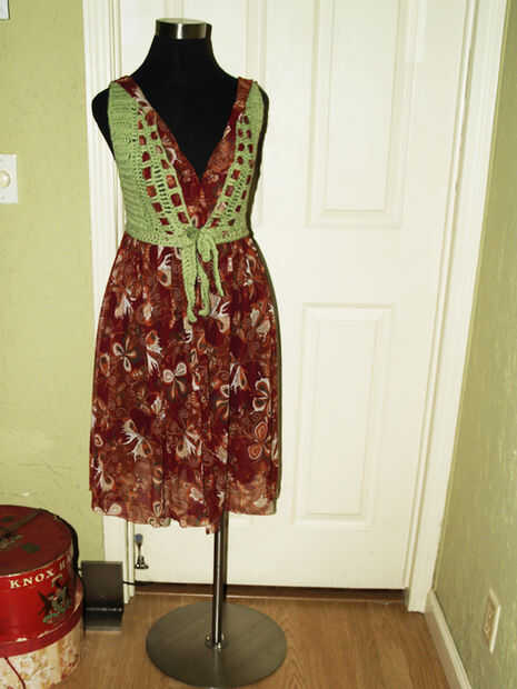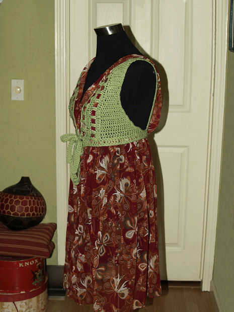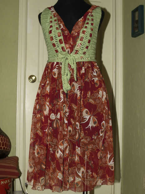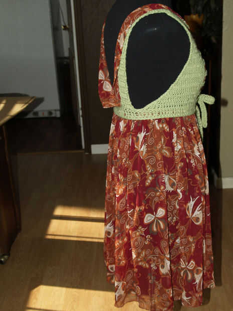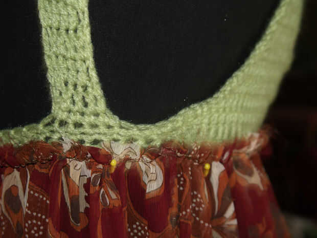 La parte superior era hecho a ganchillo sin un patrón, sólo de ojos lo que estaba haciendo y tratar sobre un lote, con una puntada doble. Hice dos conjuntos de lazos en el frente de la tela ir a la parte un poco para que sea una pulgada en el otro lado de la tela, como un abrigo. La tela fue tejida a través de los puntos de sutura en el frente. La porción de la falda entonces se reunieron y había cosido en la parte inferior de la parte superior.