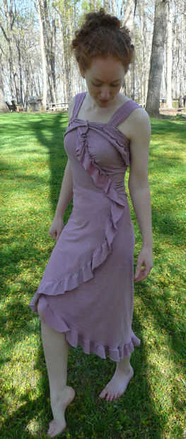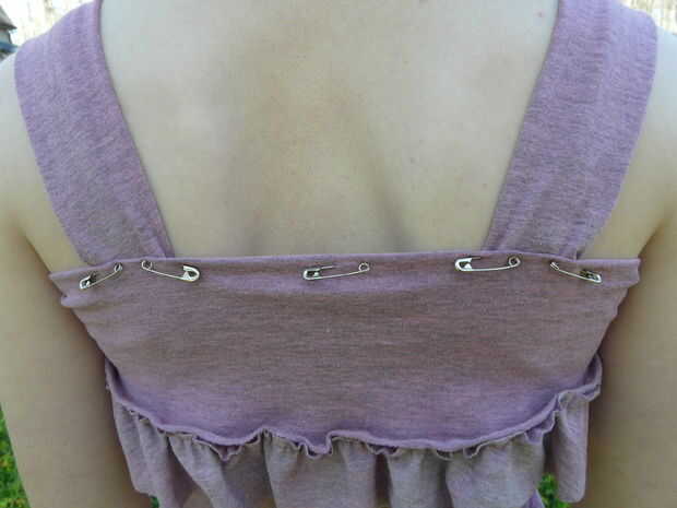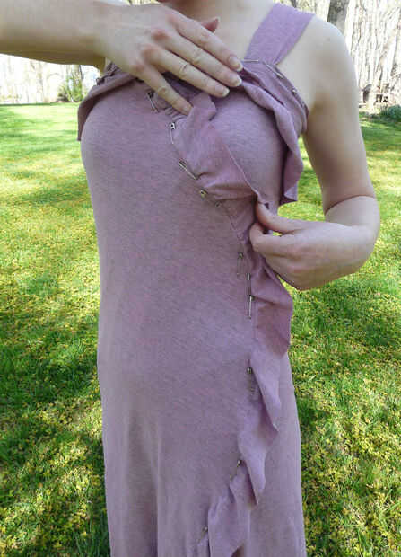 Cuando esté seguro de que ha encontrado su método favorito para cubrir el vestido y la longitud correcta de las correas, seguir adelante y fijar todo con alfileres. PIN a lo largo del borde superior donde se dobla el círculo, asegurar las correas al llegar a ellos. Luego prender el frente a través de ambas capas, justo al lado del volante, donde el vestido se envuelve sobre sí mismo en la parte delantera de su cuerpo. Se puede ver en las últimas tres fotos donde he colocado las líneas de pernos, que es donde se cose la tela en el siguiente paso. Asegúrese de que el vestido es tan ajustado como usted quiere, pero que todavía puede conseguir dentro y fuera de ella fácilmente. Hacer un giro final para asegurarse de que todo es como quieres que sea.