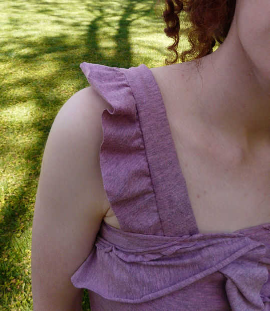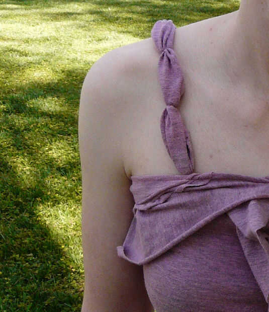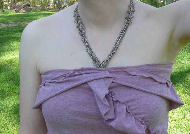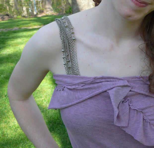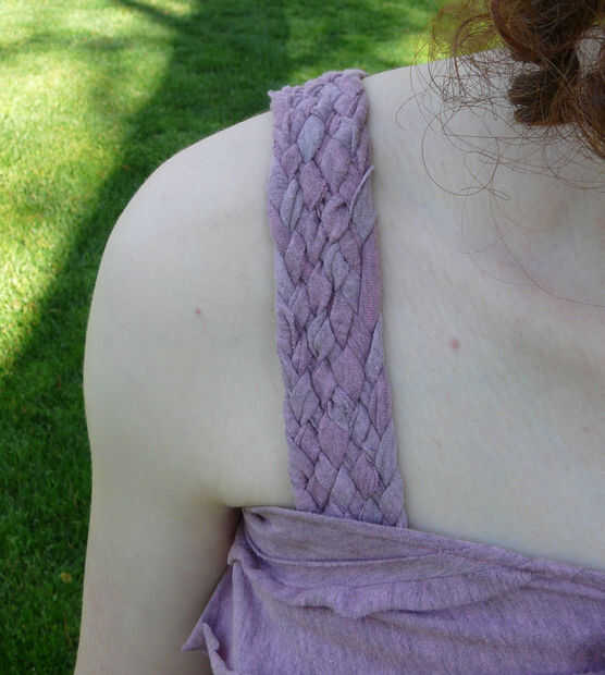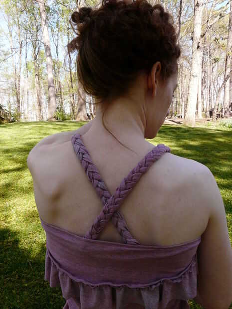 Una vez que se ha asentado en su método favorito para cubrir el vestido, adelante y prender algunas correas. Terminé usando tiras que hice por trenzar juntos pedazos sobrantes del volante. También podría utilizar los retazos de tela para hacer correas o cintas o cadenas, o hacerla un halter top... lo que quieras. Tomé fotos de varias correas para diferentes para darle algunas ideas. Incluso podría ir vestido si quieres, pero es más difícil hacer un vestido sin tirantes ajuste correctamente... así que si usted es una alcantarilla de principio, recomiendo usar algún tipo de correa.