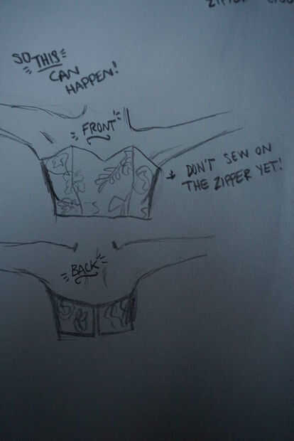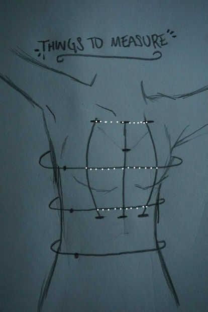 Tengo que admitir, este proyecto fue la primera vez que he hecho un patrón. Sabía muy bien que la primera vez que haces cosas como estas, los resultados suelen ser más probables que sea menos deseable. No hace falta decirlo, estaba decidida no para cagarla. Antes de hacer un patrón, usted necesita saber exactamente lo que vas a hacer y qué formas le va a hacer. Para este vestido, mira las fotos para ver lo que vamos a acabar haciendo con nuestro papel y medida en consecuencia. Usted necesitará saber la longitud de las líneas punteadas blancas así-va a venir bien al hacer el pedazo de centro del patrón.