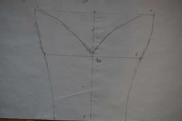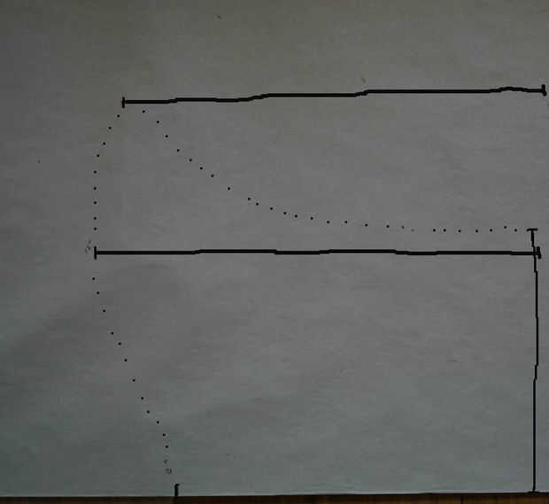 Vamos a empezar desde el centro al mismo tiempo que este patrón. Para hacer la forma de centro, trazar una línea de la longitud de la altura del vestido. Marca la parte más profunda de la línea del cuello y esbozar la forma de v alrededor de él. Ahora marca las longitudes de las líneas de puntos blancas en el último paso en la línea de altura. Una vez que hayas hecho esto, la forma de patrón en el borde de las líneas del bosquejo. Apenas como eso, ha creado la pieza central. Ahora las piezas laterales es donde se pone un poco complicado. Esto es donde vamos a utilizar las medidas que van todo el camino alrededor de su cuerpo, así como las longitudes de las líneas blancas punteadas. En primer lugar, saber cómo altura desea la parte posterior del vestido que. Marque una línea vertical que la longitud de su papel. Los tres de las líneas que vas a hacer a continuación empezará de esta línea. Vamos a comenzar con la medición que se va todo el camino alrededor de las costillas. Digamos que esta medida es 30", y la medición de la línea de puntos blanca encima de esa línea es 10". usted tendrá que restar la medida de la línea de puntos blanca (10) de la medida que fue alrededor de las costillas (30) y divida el número que sale (20) por dos. En este caso, me gustaría conseguir 10 pulgadas. por lo que llamo una línea horizontal que mide 10 pulgadas a partir de la parte inferior de la línea vertical señala al principio. Si hacemos este derecho, la longitud de la línea estamos haciendo ahora, la longitud de una línea idéntica, y la longitud de la línea inferior de la pieza central debe todo agrega hasta igual a la medida que va alrededor de las costillas. ¿Ves por qué teníamos que hacer el cálculo ahora? A continuación, vamos a pasar a lo largo a la medida que fue alrededor de la media línea del busto. Repetir el mismo proceso que hiciste para la línea de la costilla: tomar la medida que tomó de la línea del busto, restar la longitud de la línea punteada blanca en la línea del busto y dividir el número que se obtiene por dos. Ahora, dibuje una línea longitud del número que tienes a la misma altura de la línea horizontal sobre la pieza central que está en la línea del busto. Esto es muy importante hacerlo para que la pieza superior acabada no cabe extrañamente una vez que se cose juntos. Por último, repita este proceso con la línea superior, asegurándose de que hacer esta línea a la misma altura de la línea de la correa en el pedazo de centro. Una vez haya marcado todas las líneas, esbozar la forma de patrón largo de las líneas, refiriéndose a la línea de puntos negra para la referencia.