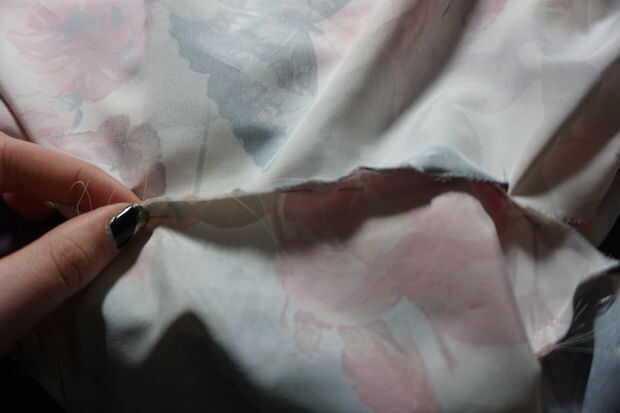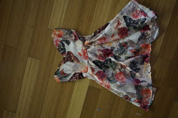 Ahora. Alinee las piezas de tela como si la ropa interior, los pin y coserlas. Una vez que haya terminado con este paso, debe parecer un vestido sin tirantes. Si la falda termina siendo un poco demasiado grande como mina, que tenga que hacer un par de pliegues en la tela.