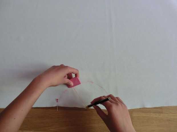 Fije un trozo de cuerda a un lápiz que servirá como una brújula. Asegúrese de que la longitud de la cuerda es el radio de la cintura. Sostener la tiza contra el extremo de la cuerda y colocar en el pin. Ahora estire la cadena colocando el lápiz afilado en el extremo de la tela. Después de esto, mover constantemente la tiza a través de la tela manteniendo el lápiz en su lugar causando un semicírculo. Marcar el área donde la línea de tiza termina con un pasador.