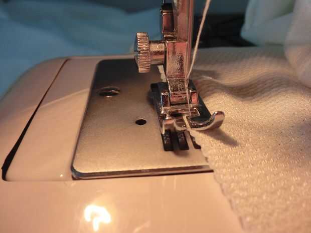 La aguja en la máquina de coser se mueve de izquierda a derecha a izquierda a derecha. Esto significa que usted tiene el lugar de la tela de manera que la aguja llega a la tela cuando se mueve a la izquierda y toca nada cuando se mueve a la derecha. Básicamente esto significa que sólo la mitad de la puntada entra en contacto con la tela. Lo que pasa es que la puntada encierra el borde.