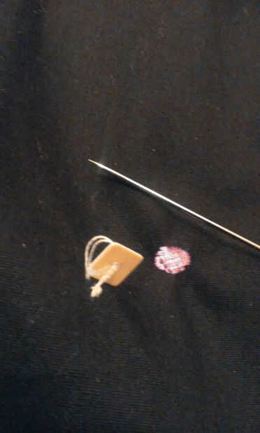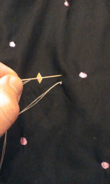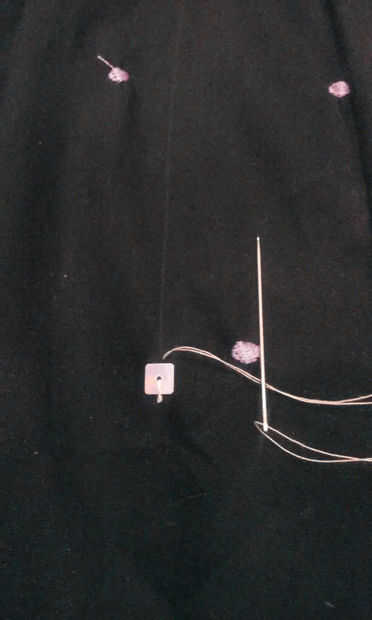 Enhebre la aguja y poner un nudo donde irá el centro inferior de la primera lentejuelas. Se trata de 1/8" por debajo del fondo Cruz marca. El cequi primero (blanco) del hilo de rosca y correr la aguja a través del centro de la primera marca cross. Pase la aguja a través a la manera de medio lado superior entre el borde superior de las lentejuelas y la siguiente marca de la Cruz (1/8" por encima de las lentejuelas). Tire del hilo firmemente bastante para hacer el cequi mentira plana, pero no tan fuerte que el tejido empieza a reunir.