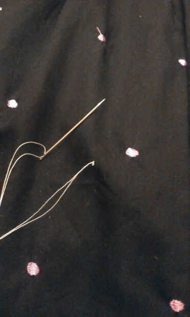 Utilice suficiente hilo para coser toda la longitud de la fila y la espalda con bastante extra para el inicio y finalización de nudos y por lo menos 6"(150mm) para la aguja y holgura. Una buena regla general para esto es casi 3 veces la longitud de la fila. Aunque no es necesario, tiendo a doble mi hilo para coser a mano para mayor resistencia, así que usar alrededor de 6 veces la longitud de la fila de hilo. En cualquier caso, pecar con hilo extra.