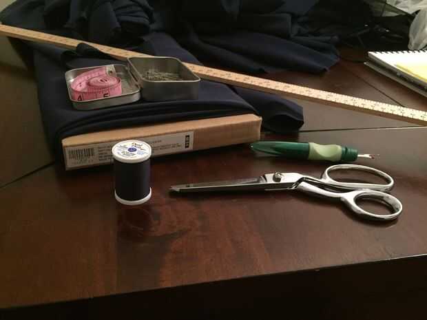 Dependiendo de sus medidas, usted se necesita 8,5 yardas de tela, 6 yardas de guarnición, que hilo, alfileres, tijeras de tela, tijeras para papel, carnicero de papel, lápiz marca, máquina de coser, aguja de coser estándar, cinta que empareja, cremallera invisible de 7-9" y un corchete.