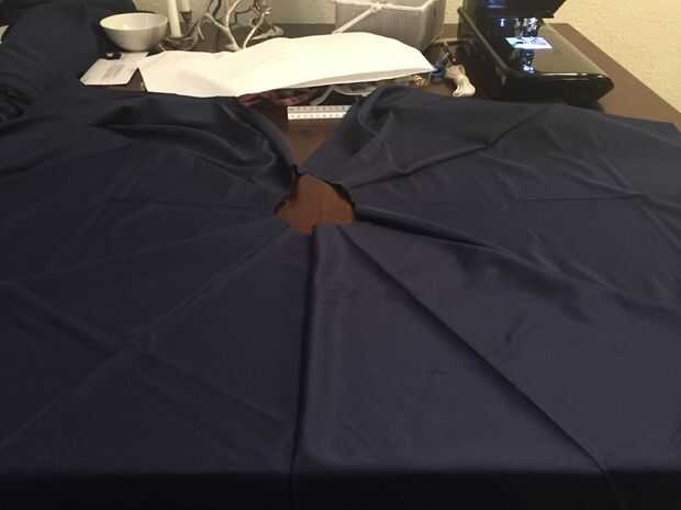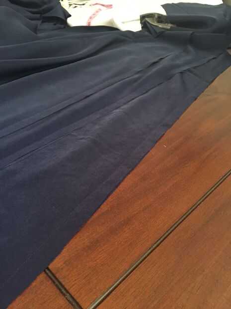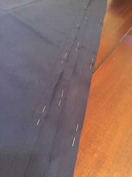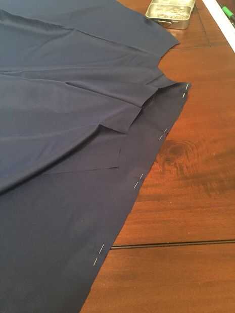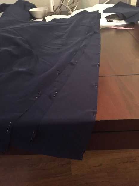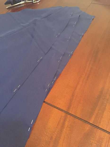 En primer lugar, tomar tu falda de forro de paneles y con mal lados juntos perno dos juntos a la vez. Coser en el margen de costura de 5/8", retire los pasadores. Luego tomar los tres paneles más grandes y coserlas a la siguiente serie de paneles en el margen de costura de 5/8" hasta que los seis paneles de la falda de la guarnición se cosen dejando la última costura abierta.