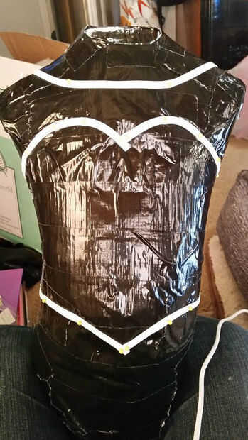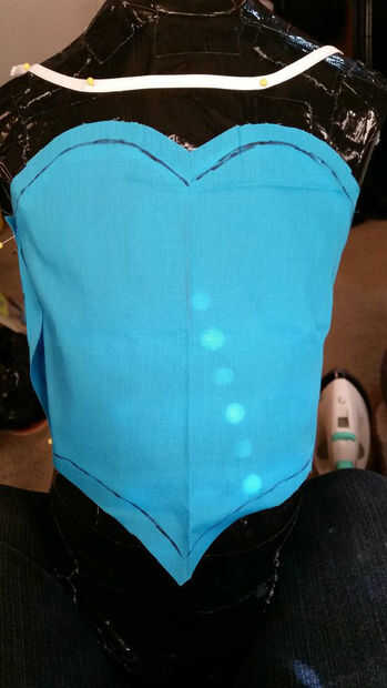 Tomando su cinta, comience a trazar en la forma del vestido, fijando en lugar. El objetivo es marcar las formas del vestido, principalmente arriba. Se trata de la forma de escote en la blusa, el escote, los agujeros del brazo, las costuras, espalda, cintura, etc.. El patrón de este puede variar dependiendo de sus gustos personales y preferencias. Puede optar por el escote de estilo de cuello de barco de Elsa, o traer cerrada hasta el cuello. Se puede ajustar la forma del vestido, o cuando el escote va, donde va el punto de la blusa, etc..