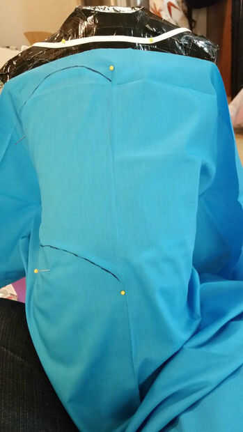 En este punto, el vestido falso debe encajar razonablemente bien. Puede ser un poco grande en algunos puntos, o un poco pequeño en otros. Use alfileres rectos más para hacer los ajustes, luego use una pluma (tela, rotulador u otro) para marcar los cambios que necesita hacer.