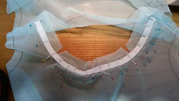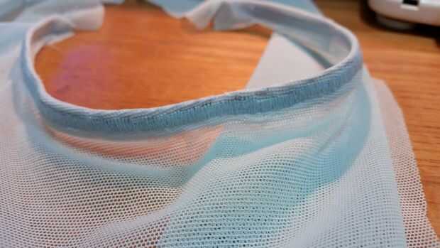 Tomando la solapa de 1/2 pulgada de margen de costura y doblar el elástico para cubrirlo, fijando en su lugar a medida que avanza. Usted puede encontrar que necesita hacer unos cortes a lo largo de las curvas, para permitir que a la tela el doblez lo que debe. Coser esto en lugar así, y luego termines con la abertura del cuello. Debe ser seguro, elástico y perfecto para pegarse una cabeza de. A continuación pasaremos a coser las mangas en lugar e insertándolos.